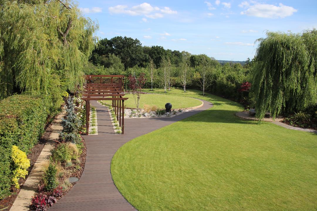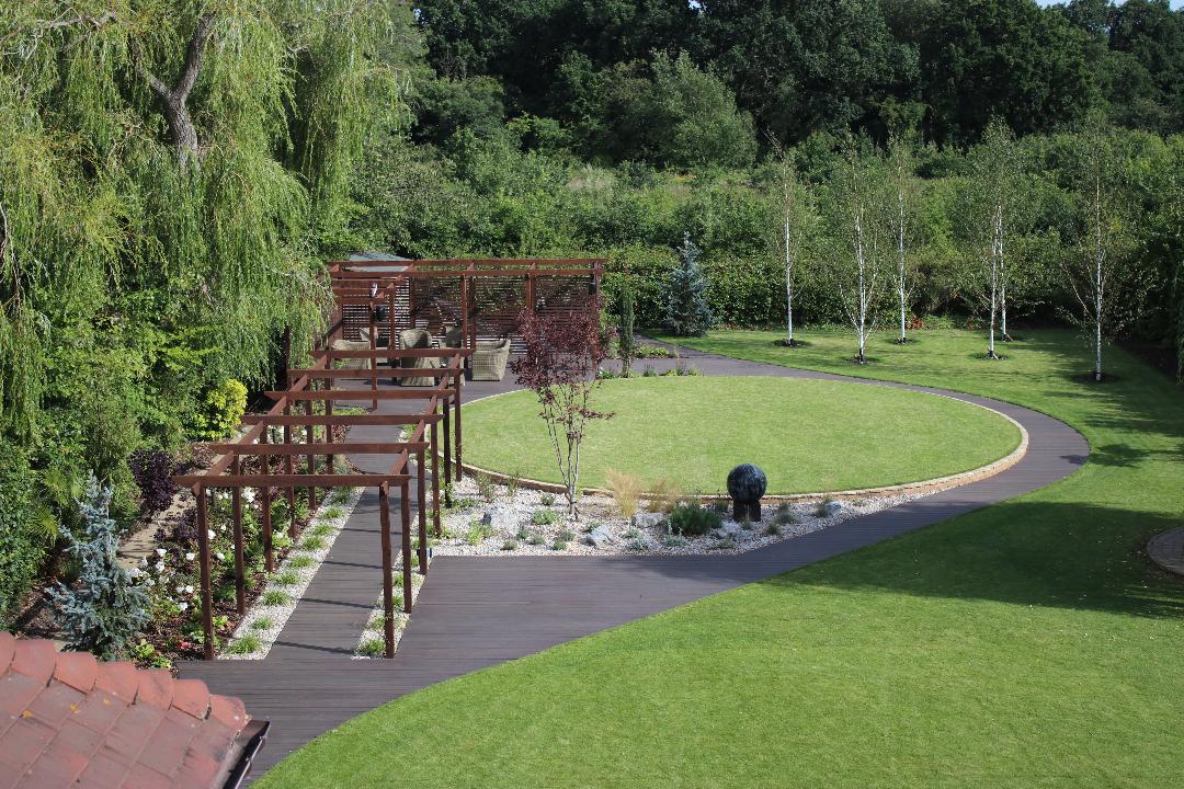 Children leaving home, gave this couple the opportunity to change their garden. Previously a rugby pitch, they wanted sweeping lines to lead the eye and create an interesting view from each window in the house. Compostite decking leads you round the garden to a large seating area to relax/entertain. With subtle lighting the garden is transformed into the perfect place to entertain and admire from the house throughout the year.